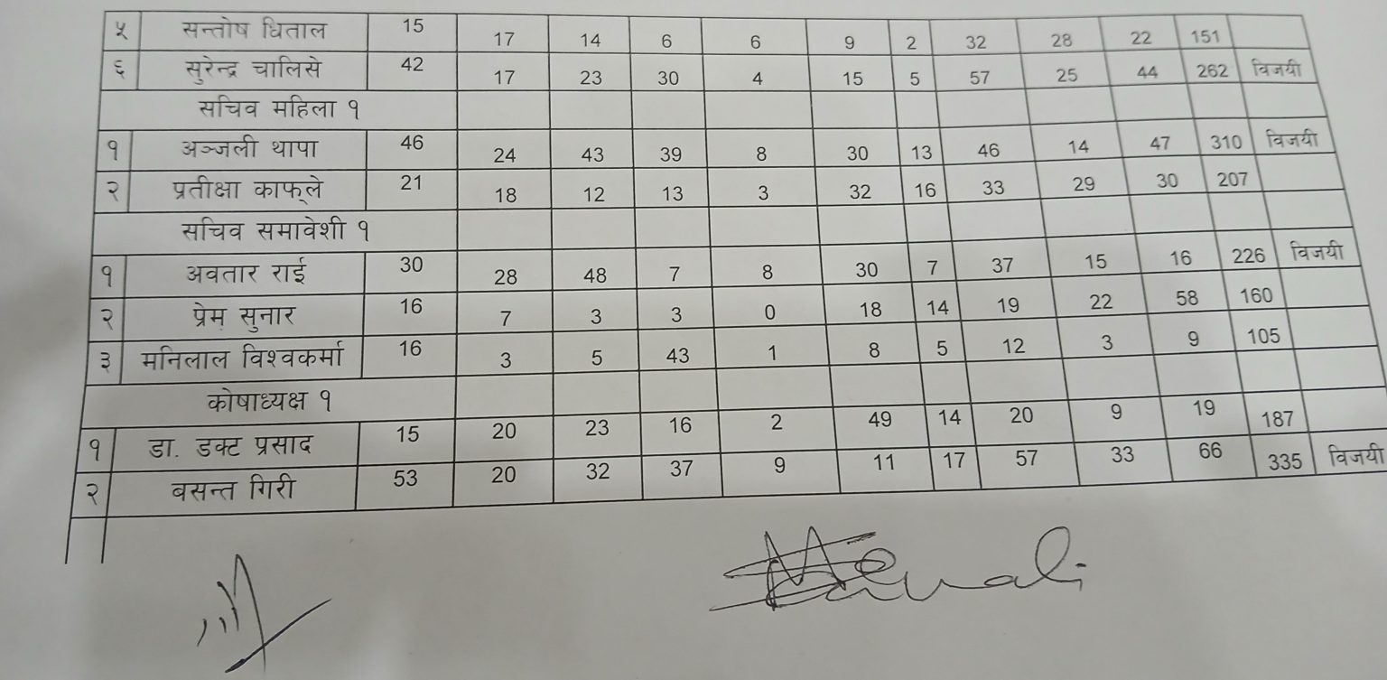 खुला सचिवमा सुरेन्द्र चालिसे र सन्तोष देउजा निर्वाचित भए । सचिव महिलामा अञ्जली थापा, सचिव समावेशीमा अवतार राई निर्वाचित भएका छन् ।