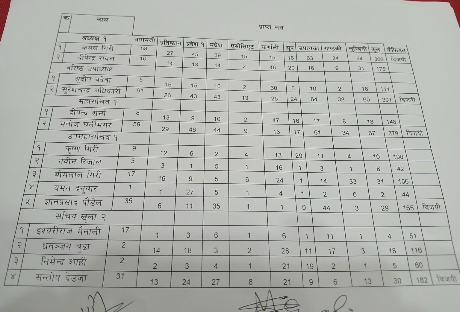 यस्तै उपमहासचिव खुलामा ज्ञानप्रसाद पौडेल १६५ मतका साथ विजयी भएका छन् । उनका निकटतम प्रतिस्पर्धी बोमलाल गिरीले १५६ मत पाए ।