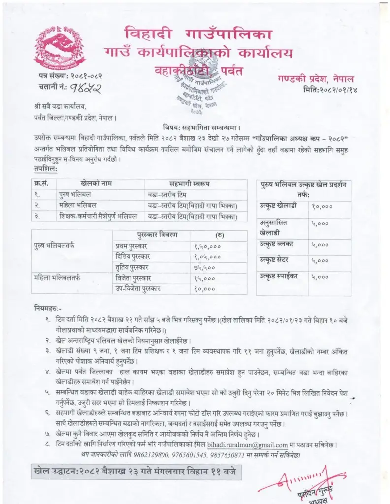 पर्वत । यहाँको एक पालिकाले अध्यक्ष कप आयोजना गर्ने भएको छ । पर्वतको बिहादी गाउँपालिकाले २३ बैशाख देखी २७ गतेसम्म “गाउँपालिका अध्यक्ष कप–२०८२” आयोजना गरेको हो । अध्यक्ष कप अन्तर्गत भलिबल प्रतियोगिता तथा विविध कार्यक्रम हुनेछन् । गाउँपालिकाले पुरुष, महिला र शिक्षक–कर्मचारी मैत्रीपुर्ण बीच भलिवल प्रतियोगिता आयोजना गरेको छ ।