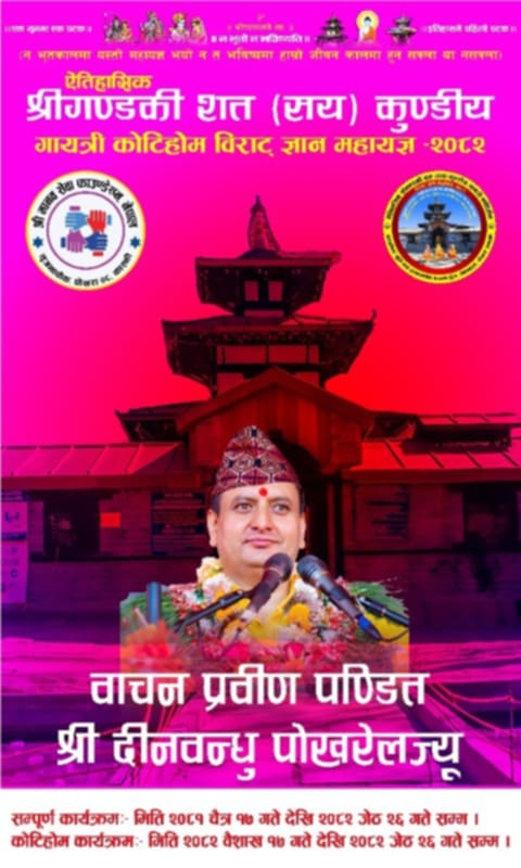 पोखरा । पोखरामा जारी श्री गण्डकी शतकुण्डीय गायत्री कोटीहोम विराट ज्ञान महायज्ञमा वाचन प्रवीण दिनबन्धु पोखरेल आउने भएका छन् । कोटीहोममा पोखरेलले आगामी बैशाख २८ गतेदेखि जेठ ३ गते कथा वाचन गर्ने कार्यक्रम तय भएको कोटीहोमका प्रचारप्रसार संयोजक लेखराज ढकालले जानकारी दिए । ढकालका अनुसार पोखरेल आफ्नै झाँकी समूह र सगीत समूह सहित कोटीहोममा सहभागी हुनेछन् ।