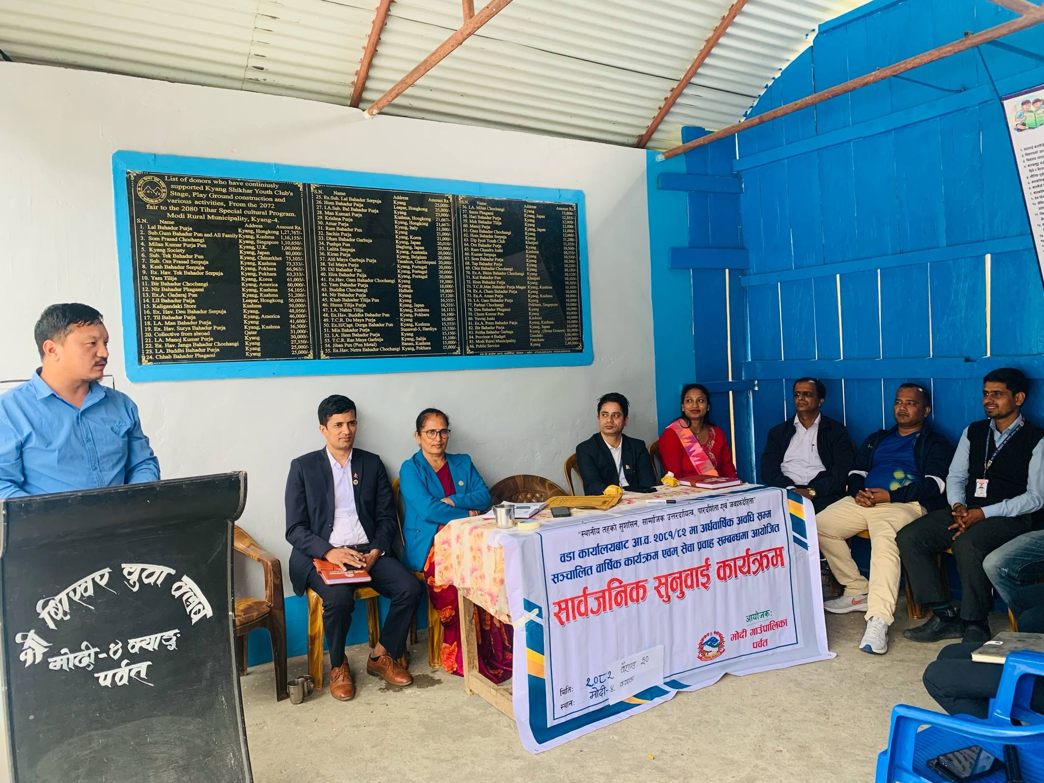 पर्वत । जिल्लाको मोदी गाउँपालिकाले वडा न ४ क्याङमा सार्वजनिक सुनुवाई कार्यक्रम सम्पन्न गरेको छ । गाउँपालिकाले आयोजना गरेको उक्त कार्यक्रममा आगामी आर्थिक बर्षको योजना छनौटका लागि सुझाबहरु संकलन समेत गरिएको थियो । गाउँपालिकाले आयोजना गरेको सार्वजनिक सुनुवाई कार्यक्रममा स्थानीयले गाउँपालिकाले चालु आर्थिक बर्षमा प्रवाह गरेका सेवा र सञ्चालन गरेका आयोजनाकहरुको विषयमा आफ्नो आफ्नो धारणा ब्यक्त गरेका थिए ।