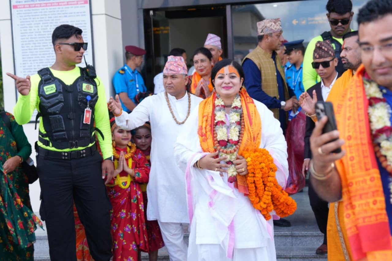 उनलाई पोखरा अन्तर्राष्ट्रिय विमानस्थलमा कोटीहोमका संकल्पकर्ता बालयोगेश्वर विजयश्री कृष्णमूर्तिजी महाराज सहित आयोजकले भव्य स्वागत गरे ।