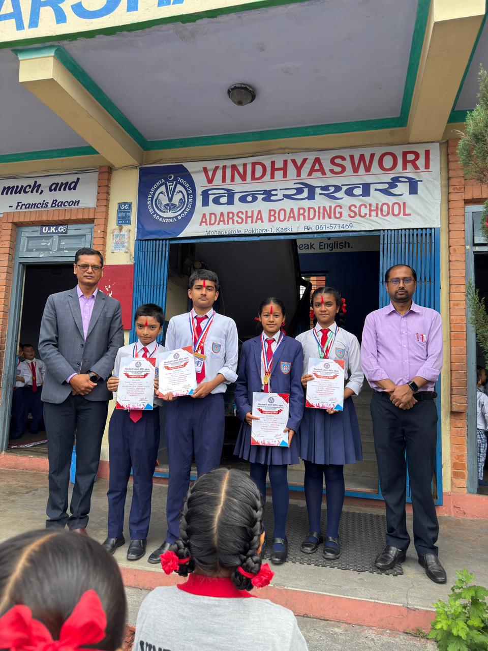 त्यसैगरी छात्रतर्फ कक्षा ७ का आदित्य लम्साल प्रथम र कक्षा ९ का दिवस घिमिरे द्वितीय भएका छन् । उत्कृष्ट विद्यार्थीलाई पुरस्कार तथा प्रमाणपत्र वितरण गर्दै विद्यालयका प्राचार्य कृष्णकुमार श्रेष्ठले विद्यार्थीहरुमा अझ बढी पढाई तथा खेलकुद सबैमा उत्तिकै लगाव होस् भन्ने हेतुले यस्ता विविध कार्यक्रमहरु संचालन हुने जानकारी गराउनुभयो ।