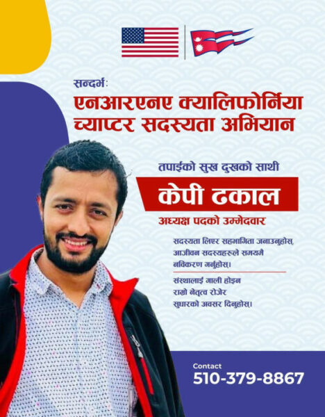 बैकुण्ठ गिरी, क्यालिफोर्निया । नेपाली समुदायसँग गहिरो लगाव राख्दै विगत १३ वर्षदेखि अमेरिकाको क्यालिफोर्निया क्षेत्रमा बसोबास गर्दै आएका कुल प्रसाद ढकाल (केपी ढकाल) ले एनआरएनए क्यालिफोर्निया च्याप्टरको अध्यक्ष पदमा पुनः उम्मेदवारी दिएका छन् ।