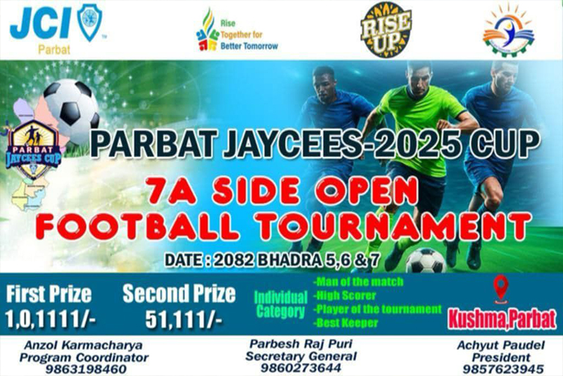 पर्वत । पर्वत जेसिजको आयोजनामा देशभरका जेसिज तथा गैर जेसिजहरुको लागि खुल्ला ‘सेभेन ए साइड फुटबल’ प्रतियोगिताको आयोजना हुने भएको छ ।