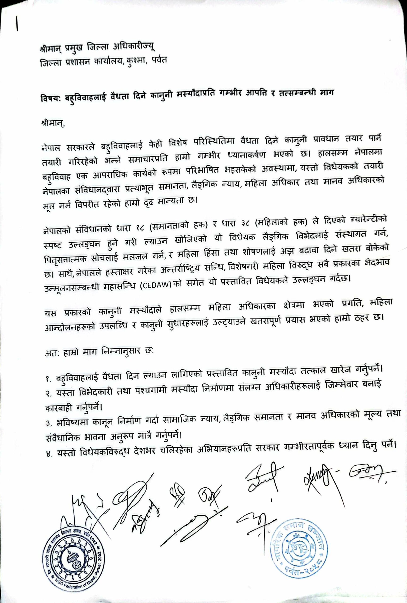 कुश्मा, पर्वत । बहुविवाहलाई केही विशेष परिस्थितिमा वैधता दिने कानुनी मस्यौदाको विरोधमा महिला अधिकारकर्मीहरू तथा विभिन्न संघसंस्थाका प्रतिनिधिहरूले प्रमुख जिल्ला अधिकारीमार्फत सरकारलाई गम्भीर आपत्ति जनाएका छन्।