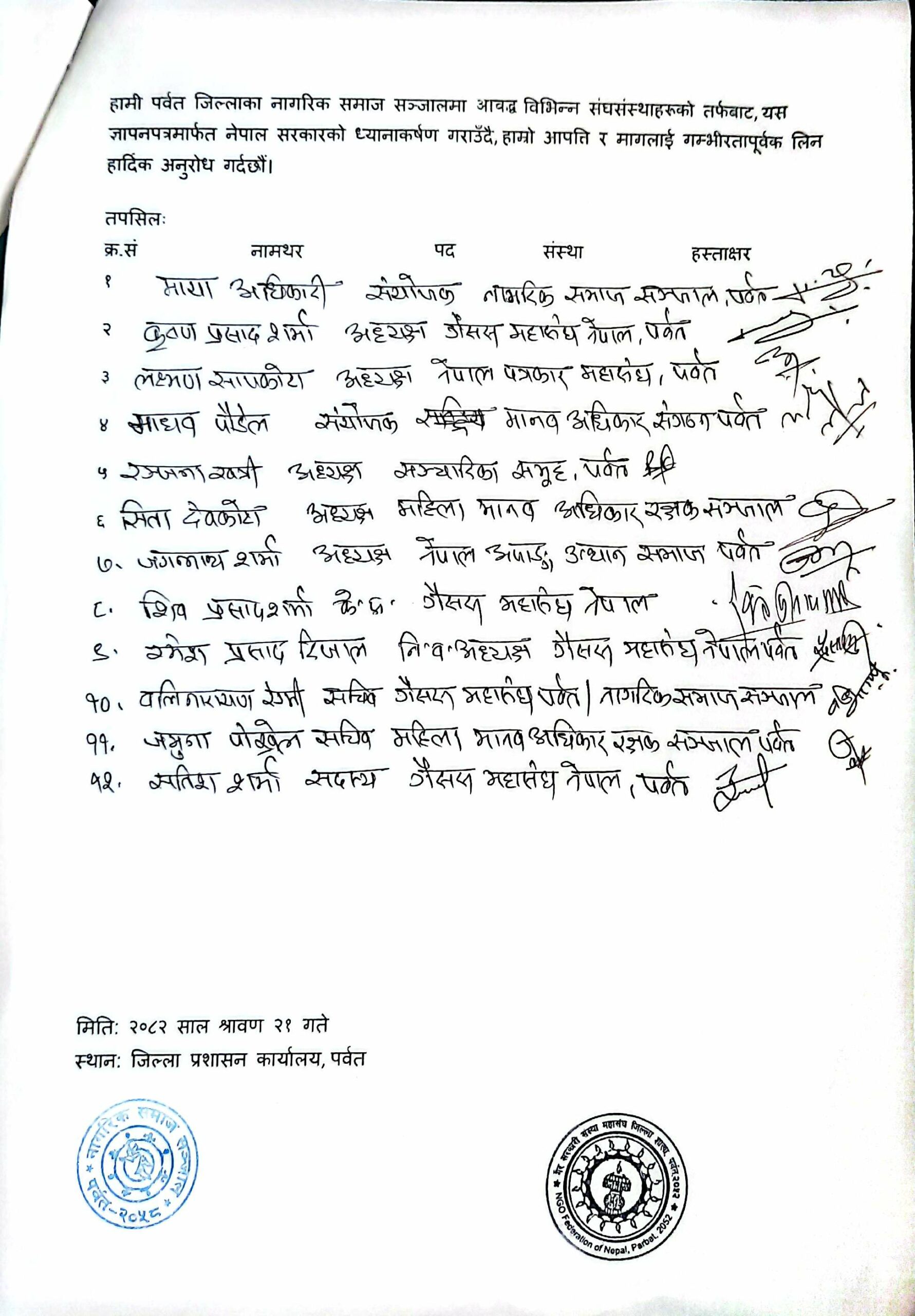 विज्ञप्तिमा नागरिक समाज सञ्जाल पर्वतकी संयोजक माया अधिकारी, गैसस महासङ्घ नेपाल पर्वतका अध्यक्ष कृष्ण प्रसाद शर्मा, नेपाल पत्रकार महासङ्घ पर्वतका अध्यक्ष लक्ष्मण सापकोटा, मानव अधिकार सङ्गठन पर्वतका संयोजक माधव पौडेल, सञ्चारीका समूहकी अध्यक्ष रञ्जना खत्री,महिला मानव अधिकार रक्षक सञ्जाल पर्वतकी अध्यक्ष सीता देवकोटा, नेपाल अपाङ्ग उत्थान समाज पर्वतका अध्यक्ष जगन्नाथ शर्मा, गैसस महासङ्घ नेपालकाका केन्द्रीय सदस्य शिव प्रसाद शर्मा लगायतले संयुक्त रूपमा हस्ताक्षर गरेका छन् ।