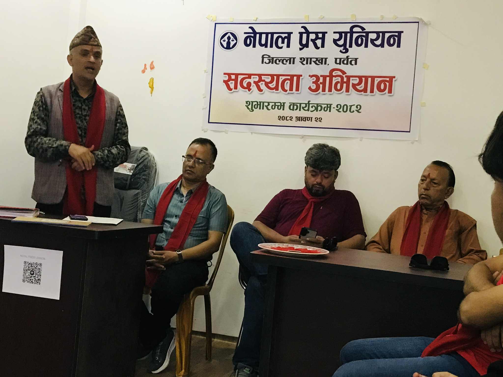 पर्वत शाखाका अध्यक्ष उत्तम प्रसाद अधिकारीले आजदेखि इच्छुक सञ्चारकर्मीहरूका लागि सदस्यता खुल्ला गरिएको जानकारी दिँदै सय दिनसम्म अभियान चलाइने बताए।