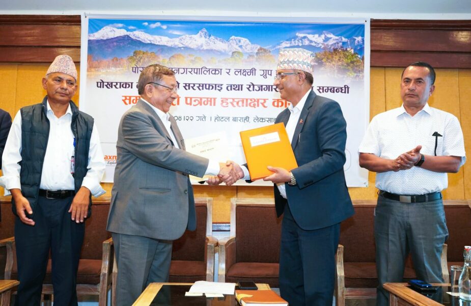 पोखरा ।पोखरा महानगरपालिका र लक्ष्मी ग्रुप फाउन्डेसन (लक्ष्मी ग्रुप) बिच वातावरण तथा पर्यावरण संरक्षणसँगै महानगर क्षेत्रमा रहेका तालहरूको सरसफाइ एवं रोजगारी सिर्जना सम्बन्धी समझदारी भएको छ । बिहीबार भएको समझदारीमा पोखरा महानगरपालिकाका प्रमुख धनराज आचार्य र लक्ष्मी ग्रुपका अध्यक्ष गणेश बहादुर क्षेष्ठले हस्ताक्षर गर्नुभएको हो ।