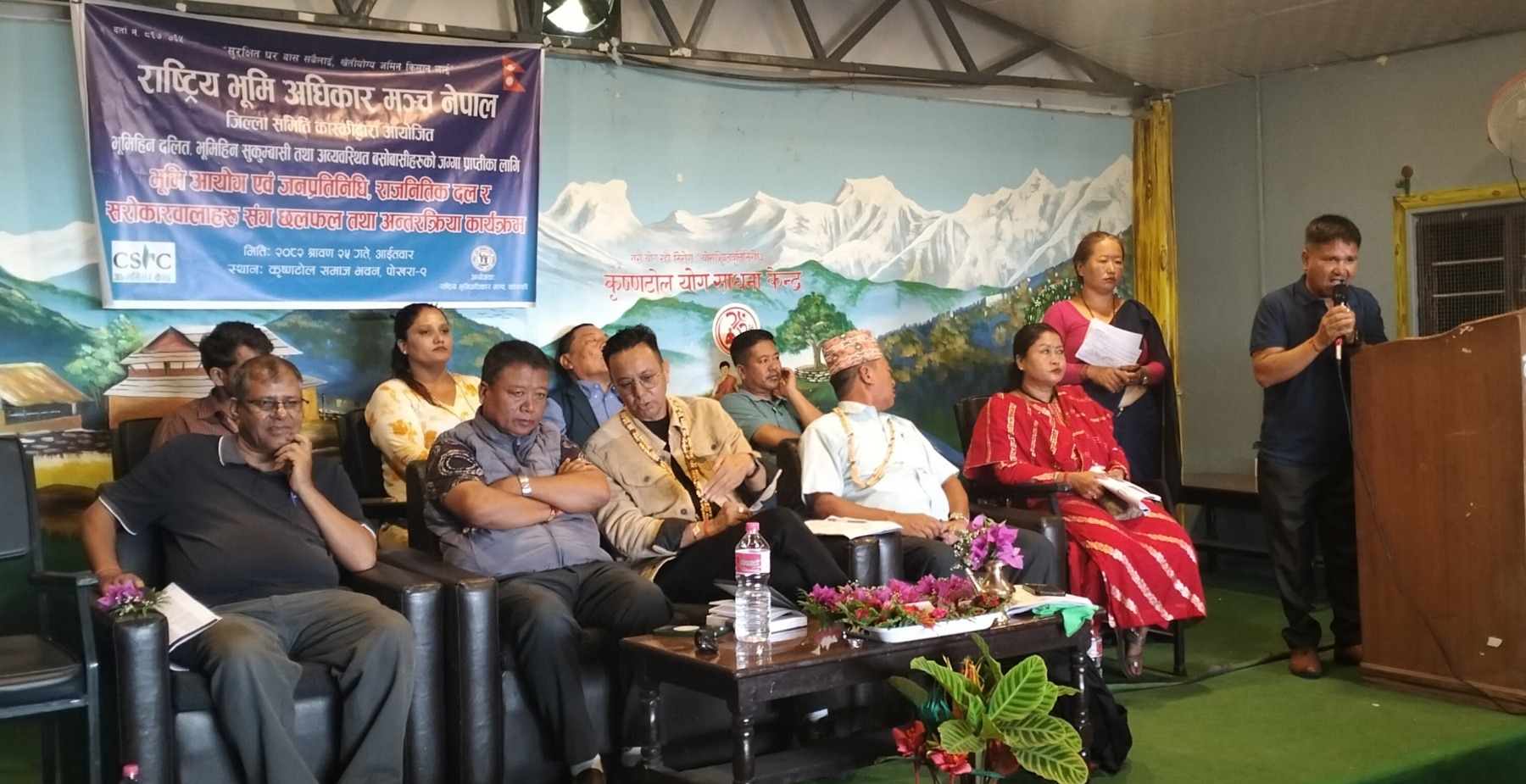 भूमिअधिकार मञ्च कास्की अध्यक्ष प्रेम बहादुर गुरुङको अध्यक्षतामा भएको कार्यक्रममा स्वागत भूमिअधिकार मञ्च पोखरा महानगरका अध्यक्ष कृष्ण परियार र संचालन मञ्च कास्कीका सचिव कुमारी गुरुङले गरेकी थिईन ।