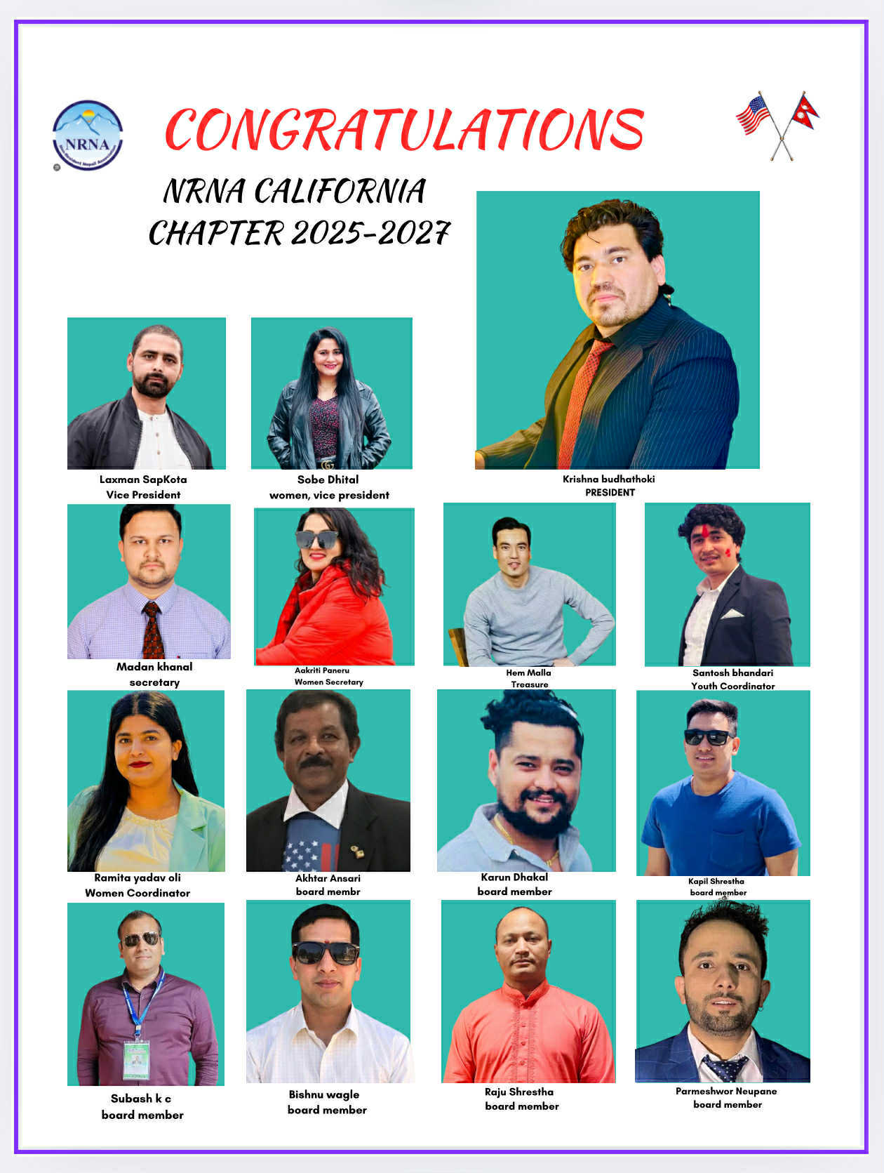 शान्ति वाग्ले पौडेल, दिक्षा बस्नेत, राप्तीसमाजका अध्यक्ष सुरेश हमाल, एनआरएनए क्यालिफोर्निया च्याप्टरका नि बर्तमान उपाध्यक्ष बासु क्षेत्री, लगायत हालै निर्वाचित उपाध्यक्ष लक्ष्मण सापकोटा, सचिव मदन खनाल, महिला सचिव आकृती पनेरु, कोषाध्यक्ष हेम मल्ल मुनाल लगायतले पनि आफ्नो धारणा राख्नु भएको थियो ।