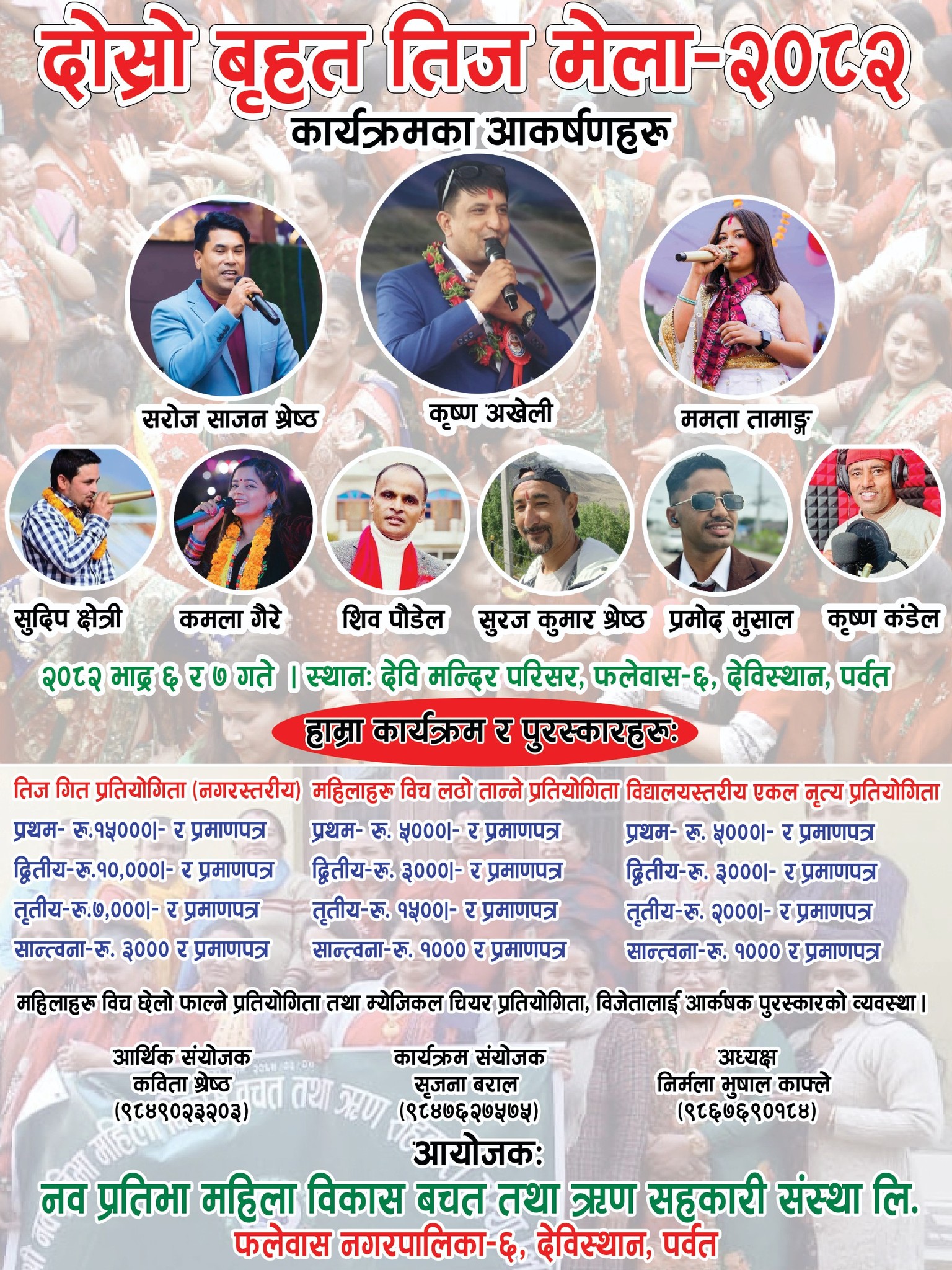 पर्वत । पर्वत जिल्लाको फलेवास नगरपालिका–६, देविस्थानस्थित देवी मन्दिर परिसरमा आगामी भाद्र ६ र ७ गते “दोस्रो बृहत् तीज मेला–२०८२” भव्य रुपमा आयोजना हुने भएको छ। नव प्रतिमा महिला विकास बचत तथा ऋण सहकारी संस्था लिमिटेडको आयोजनामा हुने यस मेलामा सांगीतिक प्रस्तुति, प्रतियोगिता तथा सम्मान कार्यक्रम रहनेछन्।