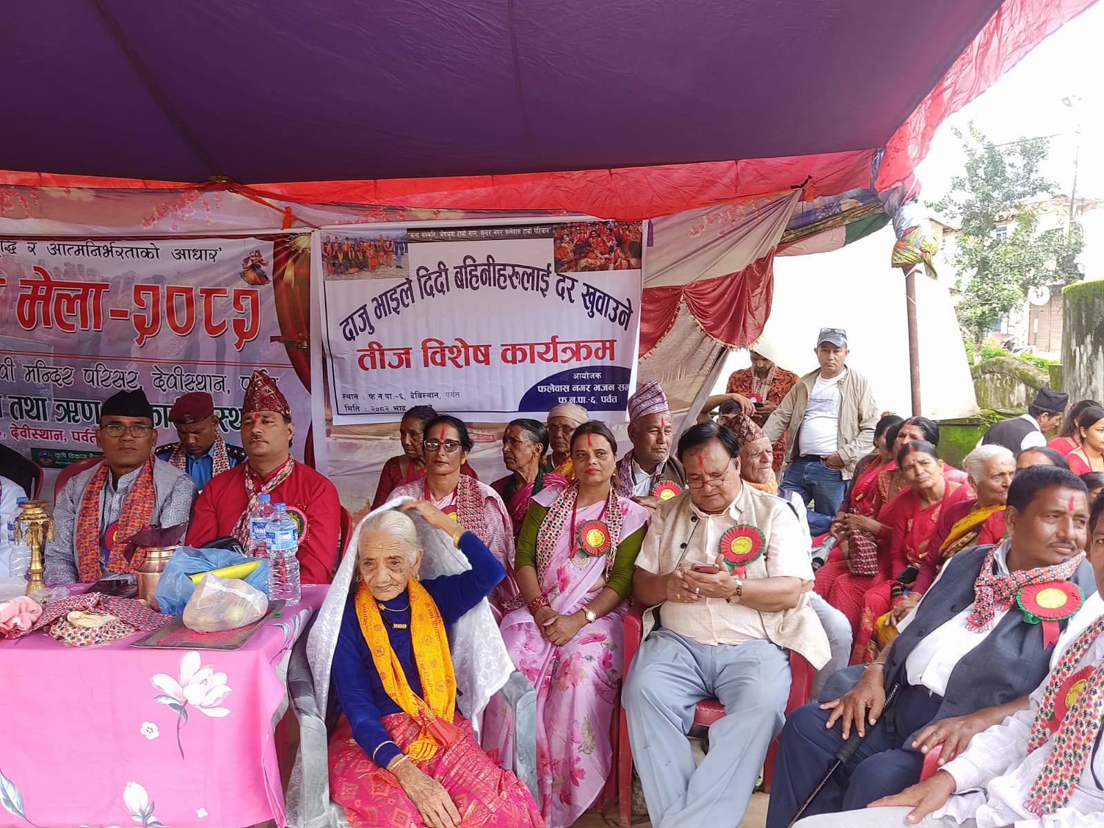 पर्वत । पर्वत जिल्लाको फलेवास नगरपालिका–६, देविस्थानस्थित देवी मन्दिर परिसरमा बृहद दोस्रो तीज मेला २०८२ हिजोदेखि शुरु भएको छ ।नव प्रतिभा महिला विकास बचत तथा ऋण सहकारी संस्था लिमिटेडको आयोजनामा संचालित मेलामा तीज गीत प्रतियोगिता, महिलाहरुबीच लठ्ठो तान्ने प्रतियोगिता, छेलो तथा एकल नृत्य प्रतियोगिता लगायतका कार्यक्रमहरु रहेका छन् । शुक्रवार विद्यालय स्तरीय एकल नृत्य प्रतियोगिता सम्पन्न भएको छ भने आज छेलो फाल्ने, रस्साकस्सी र तीज गीत प्रतियोगिता संचालन हुने नव प्रतिभा महिला विकास बचत तथा ऋण सहकारी संस्था लिमिटेडका सचिब सृजना बरालले जानकारी दिनुभयो ।