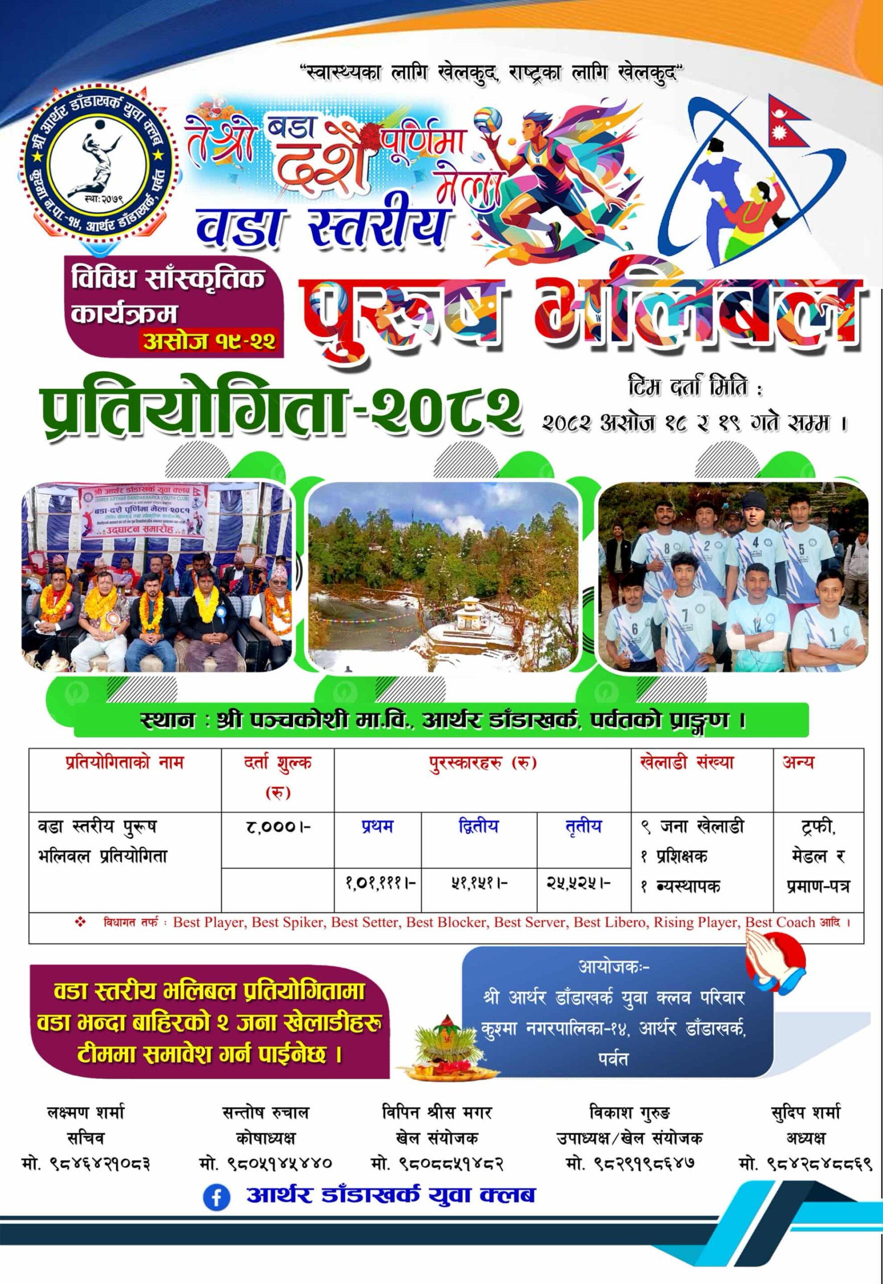 पर्वत । कुस्मा नगरपालिका–१४, आर्थर डाँडाखर्कमा तेस्रो वडा दशैं–पूर्णिमा मेला 2082 अन्तर्गत वडा स्तरीय पुरुष भलिबल प्रतियोगिता हुने भएको छ ।