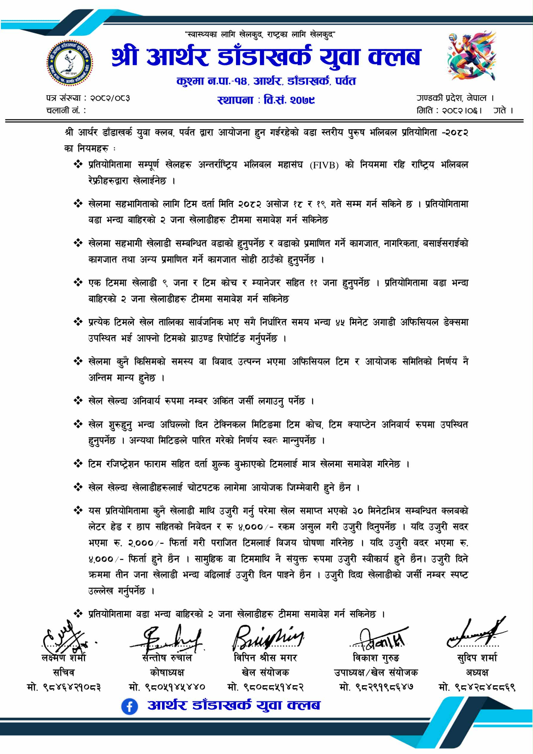 आर्थर डाँडाखर्क युवा क्लबको आयोजनामा असोज १९देखि २२गते हुने प्रतियोगितामा स्थानीय टोलीहरूको सहभागिता रहनेछ । प्रतियोगिता श्री पञ्चकोशी मावि, आर्थर डाँडाखर्क, पर्वतको प्राङ्गणमा सञ्चालन हुने क्लबले जनाएको छ ।