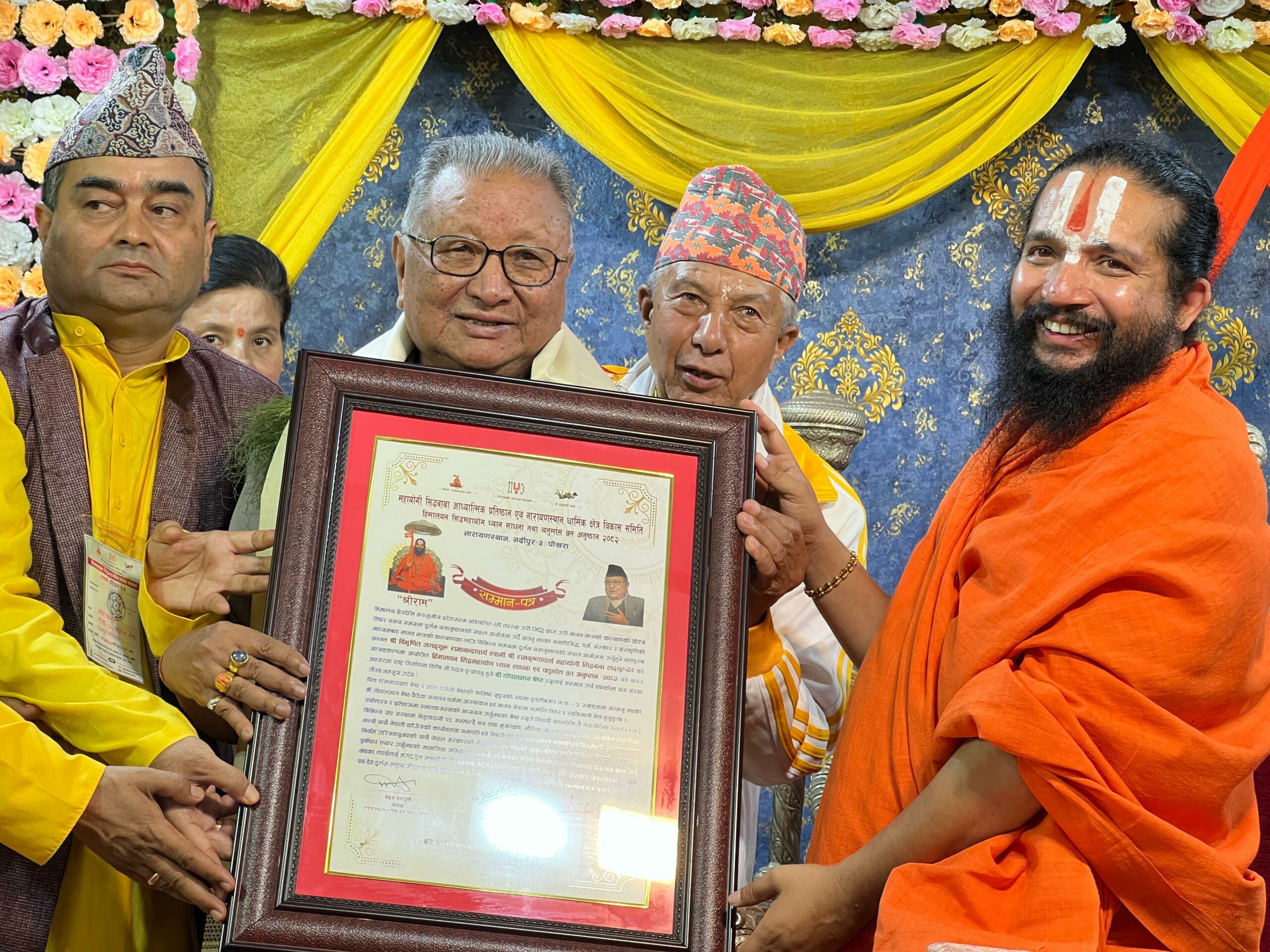 श्री लक्ष्मीनारायण मन्दिर परिसरमा सम्पन्न भव्य समारोहमा अनन्त श्री विभूषित श्रीमज्जगतगुरु श्री रामानन्दाचार्य स्वामी श्री रामकृष्णाचार्य महायोगी सिद्धबाबा सद्गुरुदेवको पावन सत्सङ्कल्पअनुसार श्रेष्ठलाई सम्मानपत्र, माला र दोसल्ला अर्पण गरी अभिनन्दन गरिएको थियो।