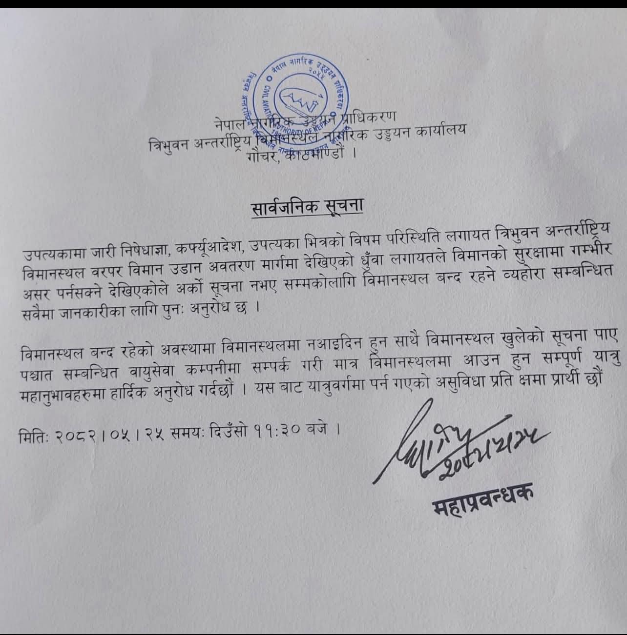 विषम परिस्थितिका कारण अनिश्चितकालका लागि बन्द गरिएको विमानस्थल कार्यालयले जनाएको छ । कार्यालयले एक सूचना जारी गर्दै विमानस्थल अर्को सूचना जारी नभएसम्म नखुल्ने स्पष्ट पारेको हो ।