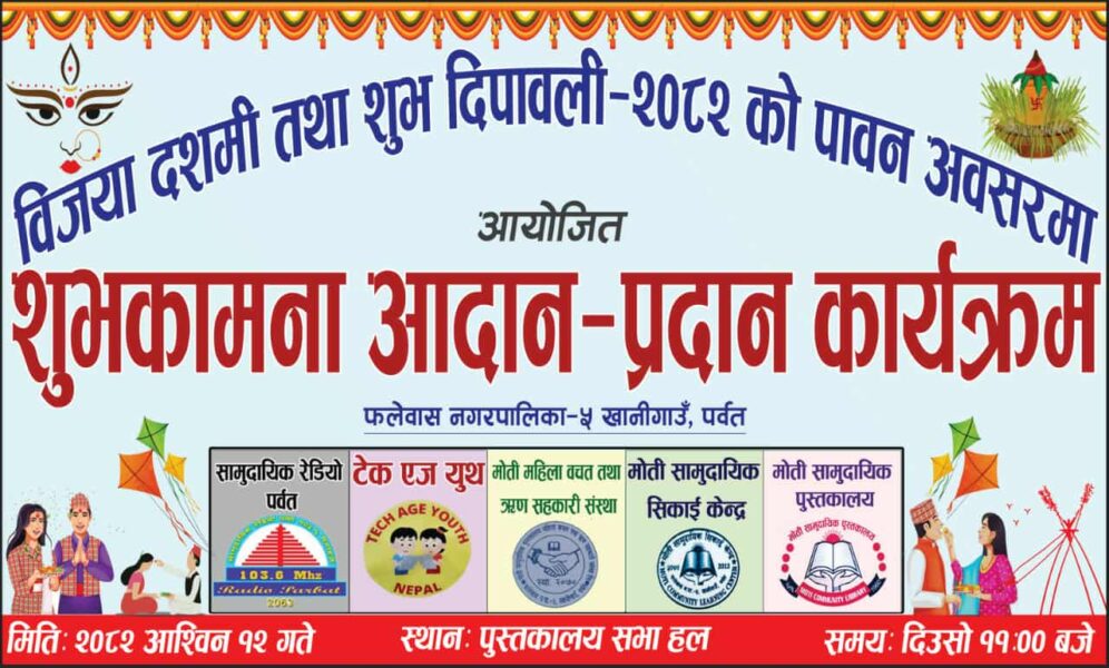 रामचन्द्र भुसाल, पर्वत । विजया दशमी तथा शुभ दिपावलि २०८२ को अवसर पारी पर्वतको फलेवासमा शुभकामना आदानप्रदान कार्यक्रम सम्पन्न भएको छ । मोती सामुदायिक पुस्तकालय, समुदायिक रेडियो पर्वत, मोती सामुदायिक सिकाई केन्द्र, मोती महलिा बचत तथा ऋण सहकारी संस्था, र टेक एज युथको आयोजनामा कार्यक्रम सम्पन्न भएको हो ।