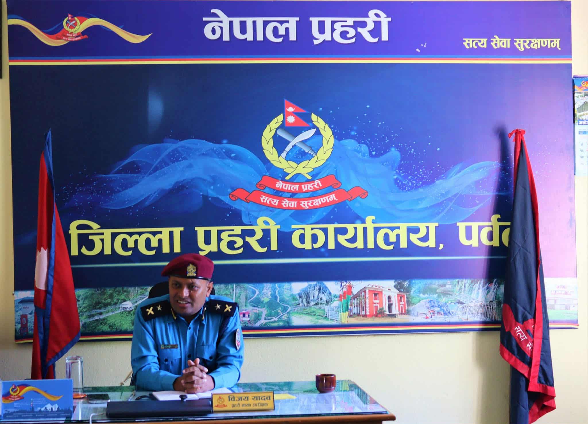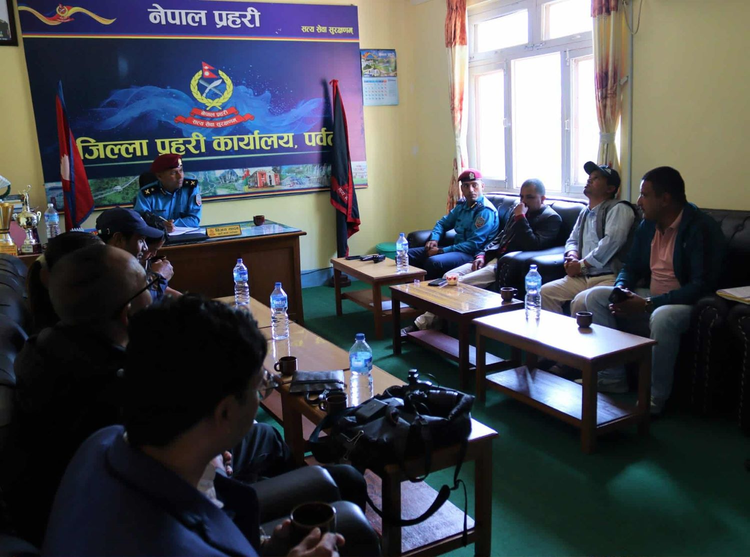 पर्वत। जिल्ला प्रहरी कार्यालय पर्वतले जिल्लाका क्रियाशिल पत्रकारहरुसँग अन्तरक्रिया कार्यक्रम सम्पन्न गरेको छ । आज जिल्ला प्रहरी कार्यालयको सभाहलमा आयोजित कार्यक्रममा कार्यालय प्रमुख प्रहरी नायव उपरीक्षक (डीएसपी) विजय यादवको अध्यक्षता रहेको थियो ।