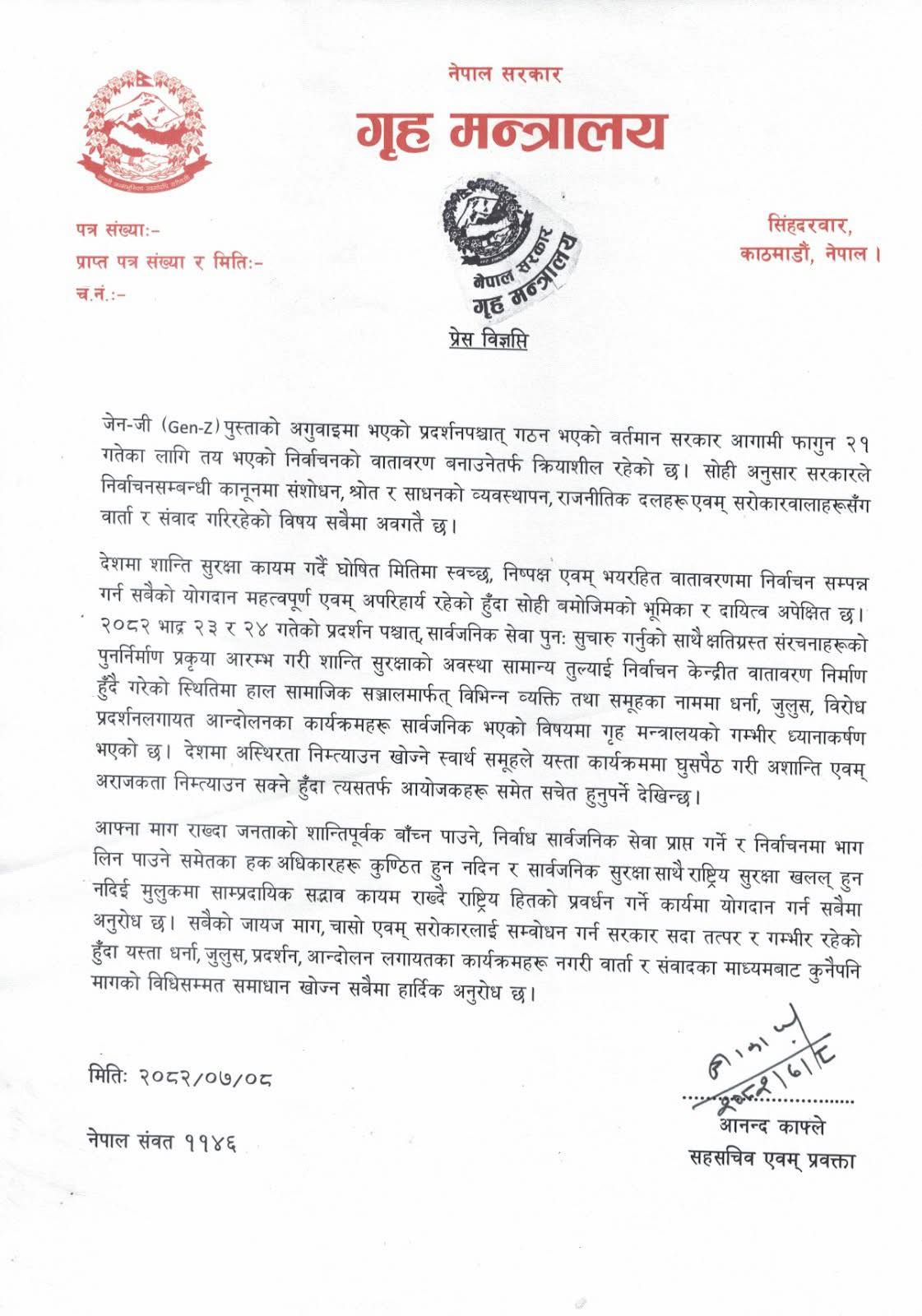 भदौ २३ र २४ गतेको आन्दोलनपश्चात् क्षतिग्रस्त संरचनाको पुनर्निर्माण गरी शान्ति सुुरक्षाको अवस्था सामान्य बनाएर निर्वाचन केन्द्रित वातावरण बन्दै गइरहेको भन्दै मन्त्रालयले देशमा अस्थिरता निम्त्याउन खोज्ने स्वार्थ समूहले यस्ता कार्यक्रममा घुसपैठ गरी अराजकता निम्तिनेतर्फ आयोजकहरू नै सचेत हुनुपर्नेमा जोड दिएको छ ।