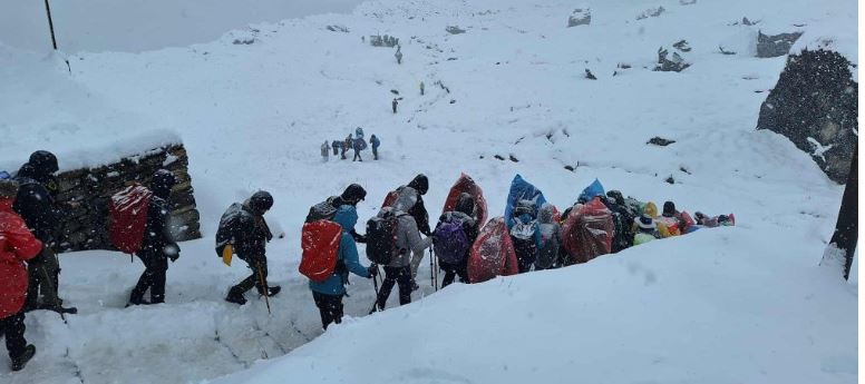 काठमाडौं । अन्नपूर्ण आधार शिविर पदयात्रामा पूर्ण रोक लगाइएको छ । सो क्षेत्रमा वर्षा र हिमपात भैरहेकाले पदयात्रामा रोक लगाइएको हो ।सो स्थानमा केही पदयात्रीहरु तल झर्न र माथि उक्लिन सकिरहेका छैनन् । उनीहरुलाई सहजीकरण गर्नका लागि नेपाल प्रहरी, सशस्त्र प्रहरी बल र स्थानीय उद्धारकर्मी इन्द्र शेरचन थकाली सहितको टोली खटिएको छ । सो टोली अन्नपूर्ण गाउँपालिकासँग समन्वय गरी परिचालित भएको हो ।