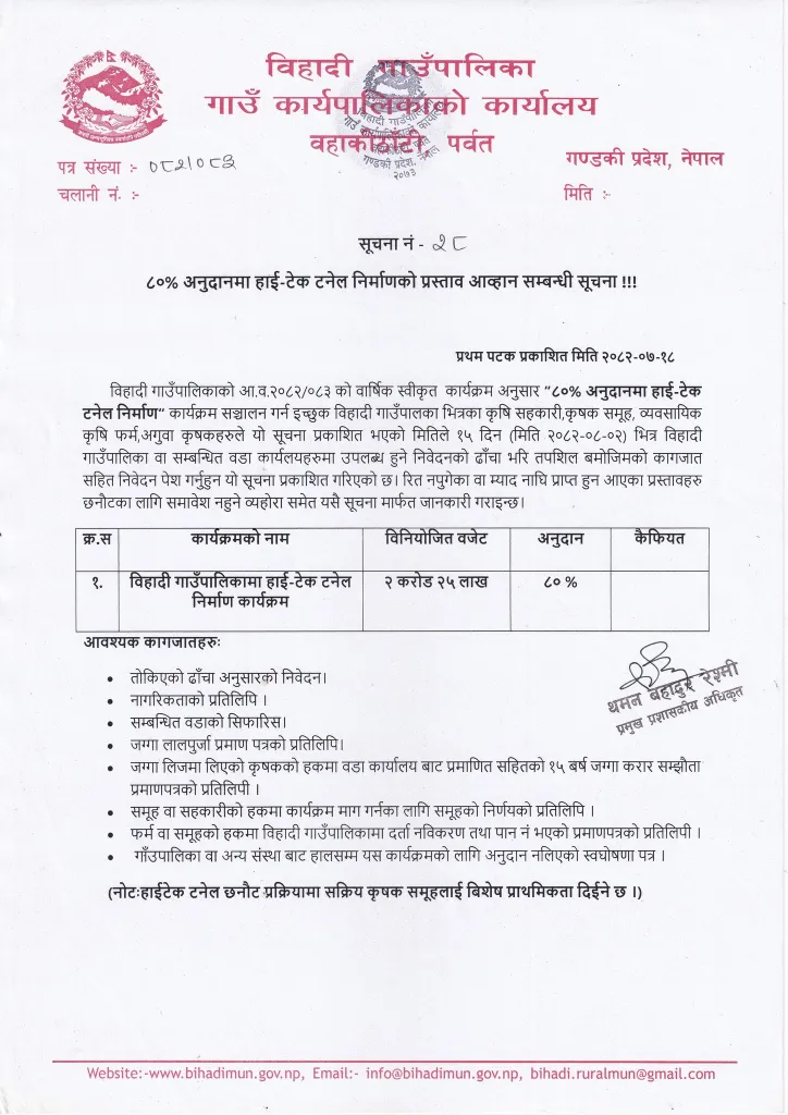 पर्वत । कृषि उत्पादनलाई आधुनिकीकरण र व्यवसायिकरणतर्फ डोर्याउने लक्ष्यसहित पर्वतको विहादी गाउँपालिका हाइटेक टनेल खेती विस्तार अभियानमा जुटेको छ । गाउँपालिकाले ८० प्रतिशत अनुदानमा हाइटेक टनेल निर्माणका लागि सहकारी संस्था, कृषक समूह तथा व्यावसायिक कृषक फार्महरूबाट प्रस्ताव आह्वान गरेको छ ।