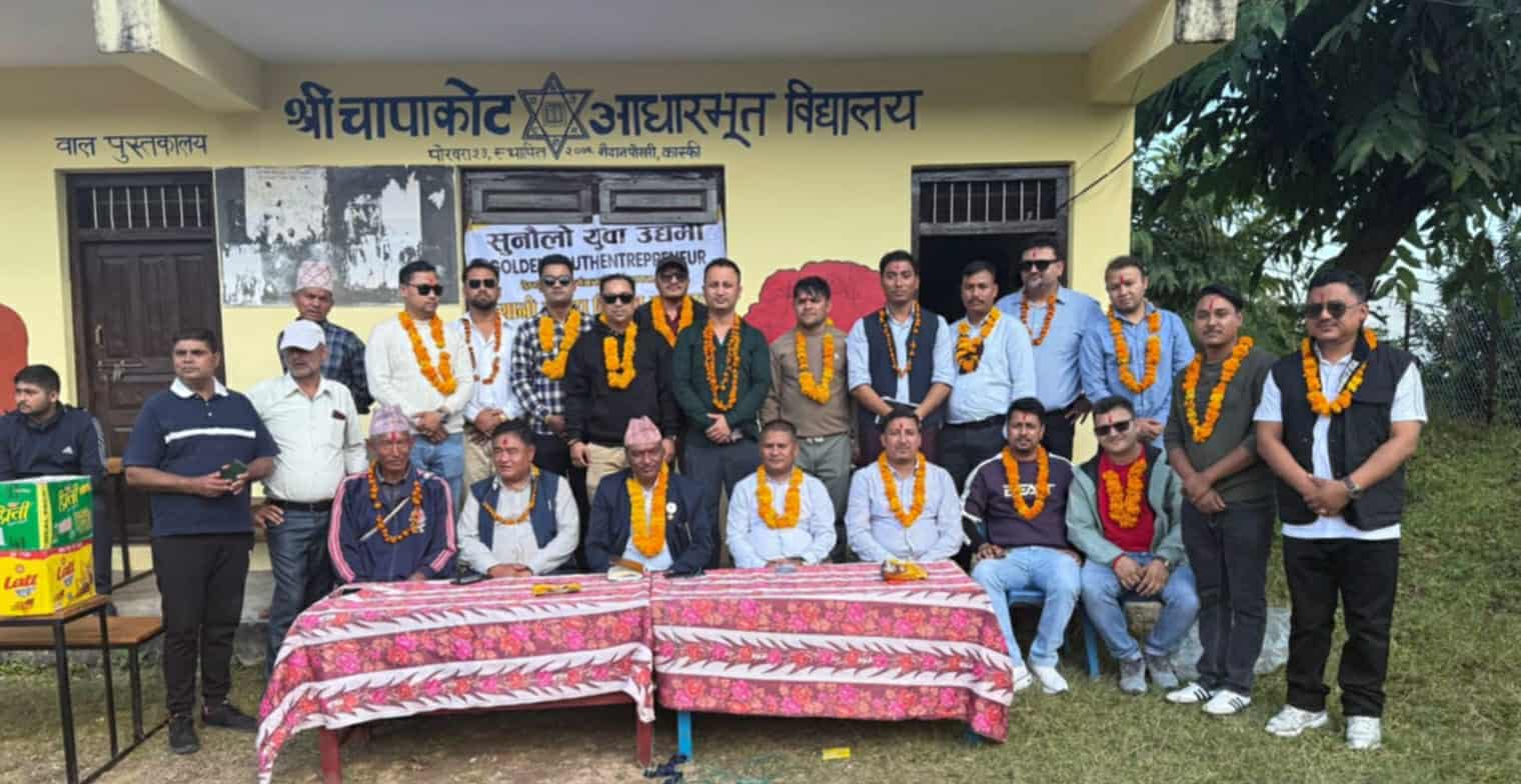 शिशिर उजाड,पोखरा। पोखरा २३ चापाकोटमा रहेको चापाकोट आधारभुत विद्यालयका विद्यार्थीलाई न्यानो कपडा सहित स्टेशनरी र खे्लकुदका सामाग्री प्रदान गरिएको छ ।पोखरामा सुनचाँदी व्यवसायमा संलग्न युवा उद्यमीको संस्था सुनौलो युवा उद्यमी संस्थाले तिहारमा देउँसी भैलो खेलेर संकलन गरेको रकमबाट त्यस विद्यालयका २७ जना विद्यार्थीलाई जाडोका लागि न्यानो कपडा सहित आवश्यक स्टेशनरी र खेलकुदका सामाग्री हस्तान्तरण गरिएको हो ।