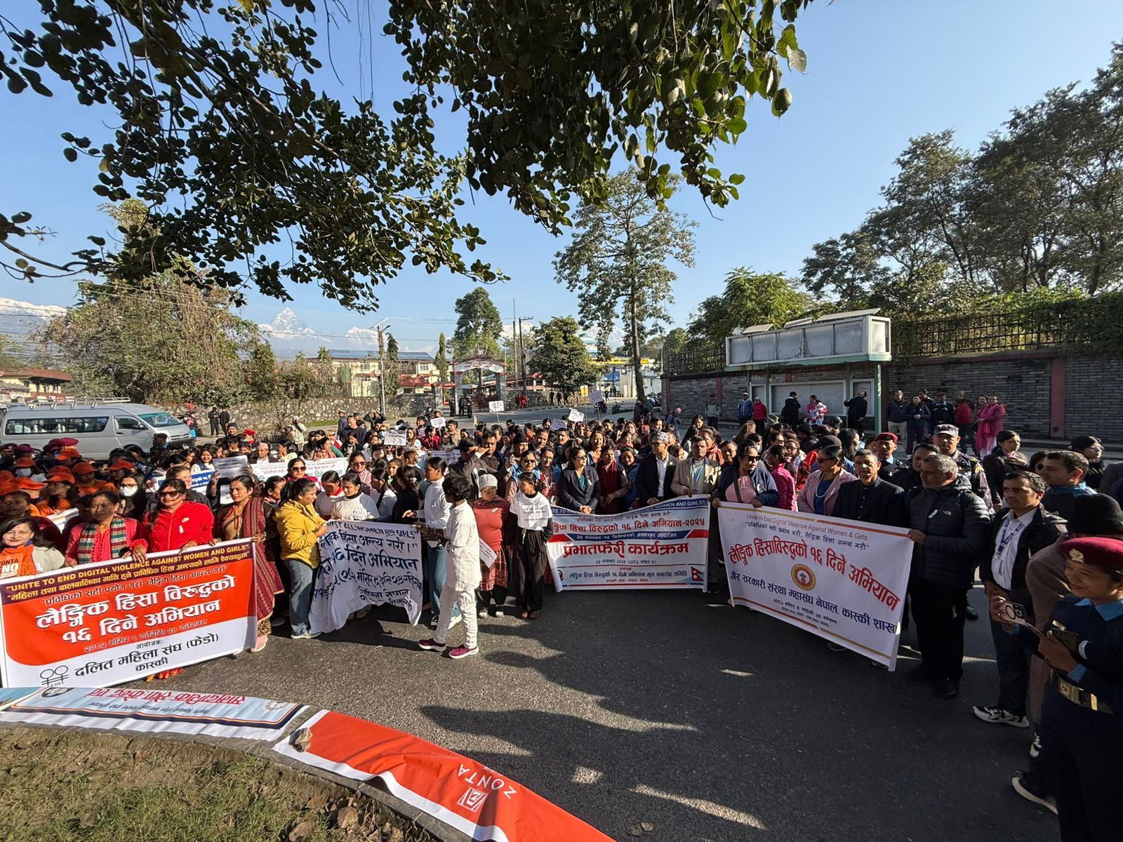 पोखरा ।लैङ्गिक हिंसा विरुद्धको १६ दिने अभियान २०२५ अन्तर्गत आयोजित प्रभातफेरी कार्यक्रममा गण्डकी प्रदेशका सामाजिक विकास, युवा तथा खेलकुद मन्त्री विन्दु कुमार थापाले महिलामाथि हुने सबै प्रकारका हिंसा अन्त्यका लागि राज्यदेखि समाजसम्मको सामूहिक प्रतिबद्धता आवश्यक भएको बताएका छन्।