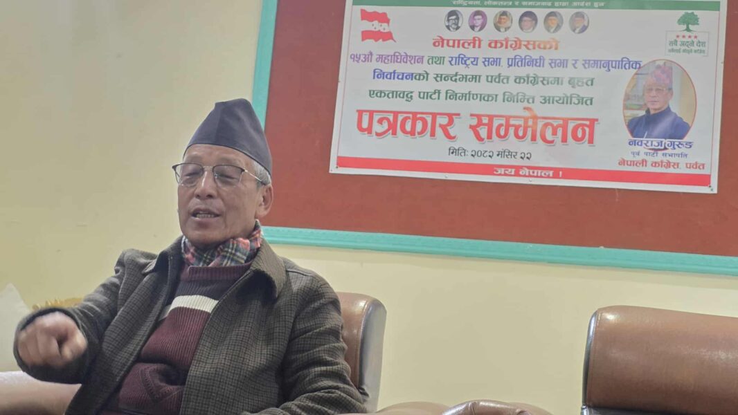 पर्वत। नेपाली काँग्रेस पर्वतका पुर्व पार्टी सभापति नबराज गुरुङले आगामी फागुन २१ गते हुने प्रतिनिधि सभाको निर्वाचनमा उम्मेदवार बन्ने आकांक्षा व्यक्त गर्नुभएको छ । सोमवार कुश्मामा पत्रकार सम्मेलन गर्दै गुरुङले पर्वत काँङ्ग्रेसलाई बृहद एकताबद्ध गर्दै प्रत्यक्ष तर्फको उम्मेदवार बन्ने संकेत गर्नुभएको हो । नेपाली काँग्रेस पर्वतले आज प्रतिनिधि सभा सदस्य पदको निर्वाचनका लागि प्रत्यक्ष र समानुपातीक तथा राष्ट्रिय सभा सदस्य पदका लागि उम्मेदवार सिफारीस गर्ने सम्वन्धमा छलफल गर्न बैठक आव्हान गरेको पुर्व सन्ध्यामा गुरुङले पत्रकार सम्मेलन गर्दै प्रत्यक्ष निर्वाचनमा उम्मेदावारी दिने बताउनुभएको हो ।