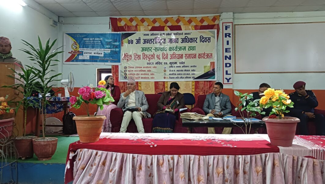 ७७ औँ अन्तर्राष्ट्रिय मानवअधिकार दिवसको अवसरमा अन्तरसंवाद सहित कार्यक्रम समापन गरिएको हो । लैंङ्गिक हिंसा न्यूनिकरणका लागि लामो समयदेखि विभिन्न सचेतनामुलक कार्यक्रमहरु हुँदै आएपनि समाजमा त्यस्ता खालका घटनाहरु मौलाउँदै गएको पाईएको छ । सचेतनामुलक तथा नियन्त्रणमुखि कार्यक्रमहरु प्रभावकारी हुन नसकिरहेको सरोकारवालाहरुले बताएका छन् ।