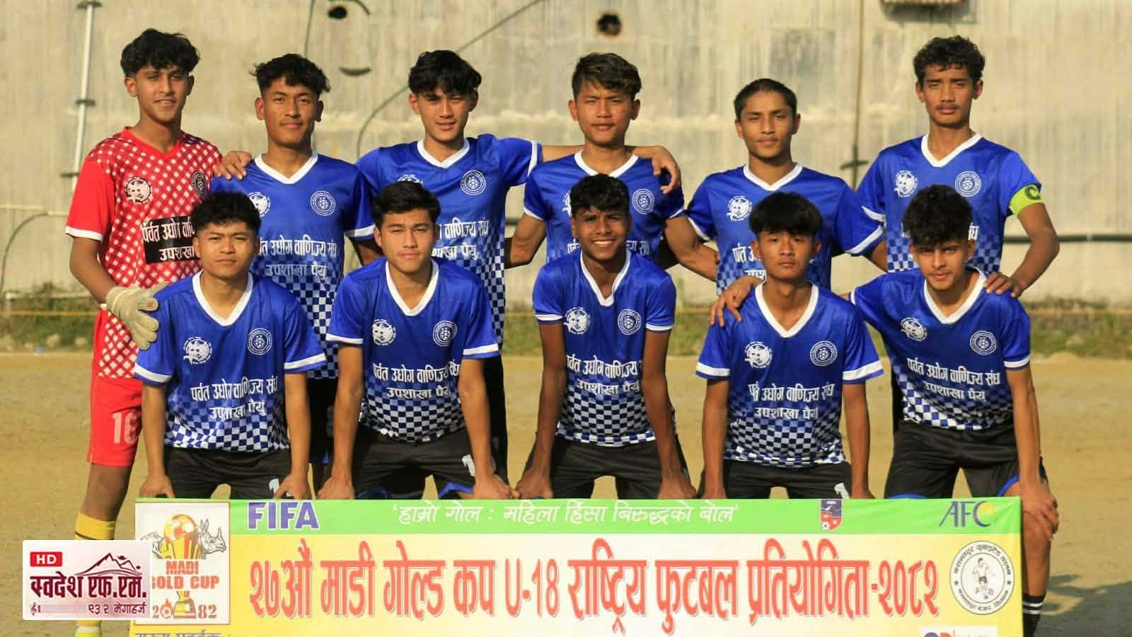 गोविन्द रिजाल,पर्वत । माडीको बसन्तपुरमा जारी २७औं माडी गोल्डकप अण्डर-१८ राष्ट्रिय फुटबल प्रतियोगितामा पटिहानी फुटबल क्लबलाई हराउँदै मर्दीखोला युनाईटेड क्लब,पर्वत फाइनलमा प्रवेश गर्यो । फाइनलमा आयोजक बसन्तपुर युनाइटेड क्लब र मर्दीखोला युनाइटेड क्लब पर्वत भिँड्ने भएका छन् ।आज सम्पन्न दोश्रो सेमीफाइनलमा पटिहानी फुटबल क्लबलाई ३-० गोलअन्तरले पराजित गर्दै युनाइटेड पर्वत फाइनल प्रवेश गरेको हो ।