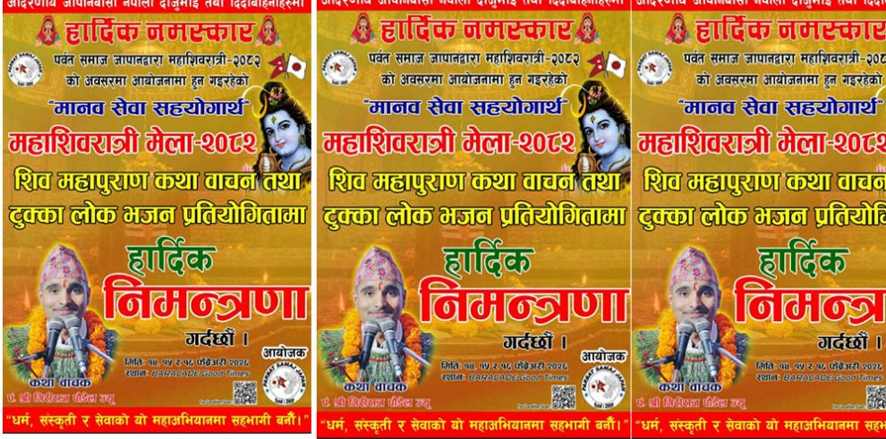 पर्वत समाज जापानको आयोजनामा मानव सेवाको उद्देश्यसहित महाशिवरात्रि मेला तथा तीन दिने शिवपुराण कार्यक्रम फेब्रुअरी १४, १५ र १६ गते टोकियोमा सञ्चालन हुने समाजका सचिव तथा कार्यक्रम प्रचार बिभाग संयोजक भोजराज भुषालले जानकारी दिनुभयो ।