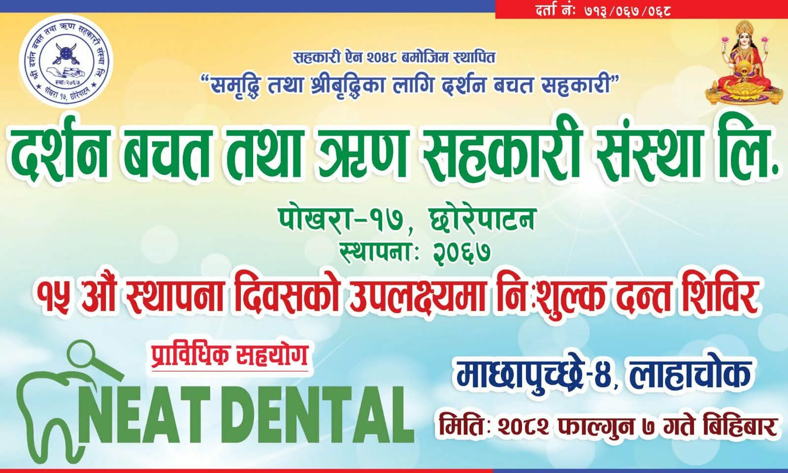 १दर्शन सहकारीको १५औं स्थापना दिवसमा निःशुल्क दन्त शिविर हुने