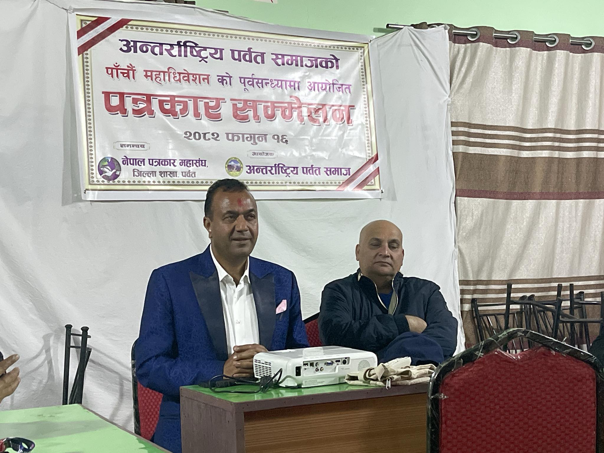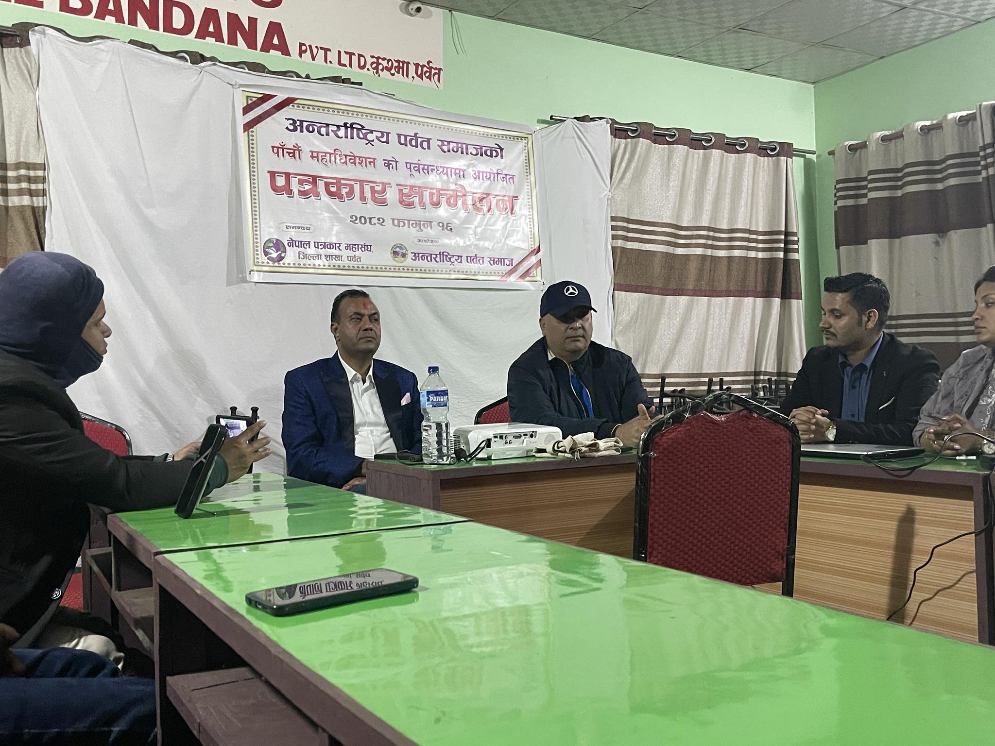 कुश्मा । अन्तर्राष्ट्रिय पर्वत समाज को पाँचौं महाधिवेशन यही फागुन २३ गते कुश्मास्थित बन्दना होटलमा आयोजना हुने भएको छ। महाधिवेशनको पूर्वसन्ध्यामा आयोजित पत्रकार सम्मेलनमा कार्यक्रम संयोजक मुना भुसालले तयारी अन्तिम चरणमा पुगेको जानकारी दिनुभयो।