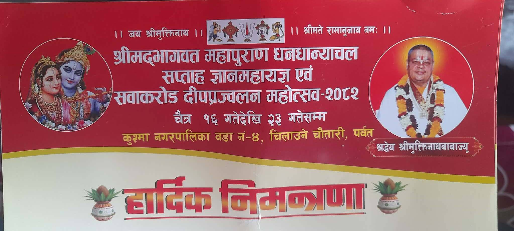 पर्वत । पर्वत सदरमुकाम कुश्मामा आगामी चैत १६ गतेदेखि २३ गतेसम्म श्रीमद्भागवत महापुराण धनधान्याचल सप्ताह ज्ञान महायज्ञ हुने भएको छ ।