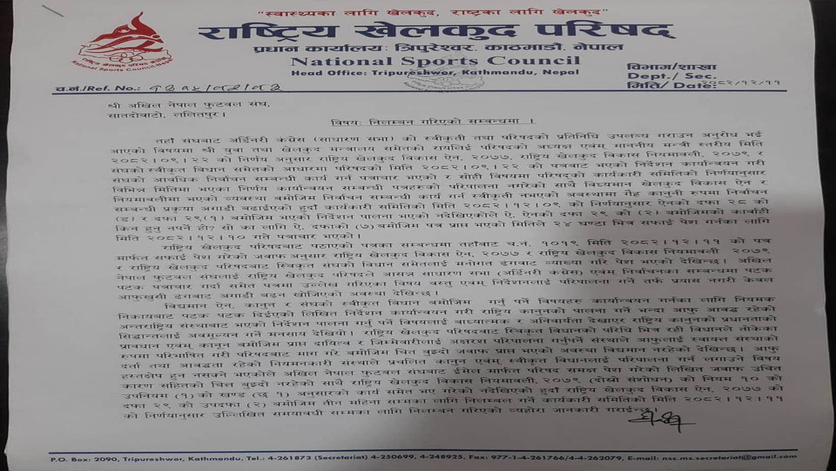 राष्ट्रिय खेलकुद परिषद् (राखेप)ले अखिल नेपाल फुटबल संघ (एन्फा) नेतृत्वलाई निलम्बन गरेको छ । पटकपटक दिएको निर्देशन पालना नगरेपछि राखेप कार्यकारी समितिको चैत ११ गते बुधबारको बैठकले खेलकुद विकास ऐन २०७७ को दफा २९ को (२) लाई टेकेर एन्फा नेतृत्वमाथि निलम्बन गर्ने निर्णय गरेको हो । राखेपले एन्फालाई पटक–पटक दिएको निर्देशन पालना नगरेको, स्वीकृति बिना निर्वाचन प्रक्रिया अघि बढाउन खोजेको तथा परिषद्बाट माग गरिएका स्पष्टिकरणहरू सन्तोषजनक नआएको आरोप लगाएको छ।
