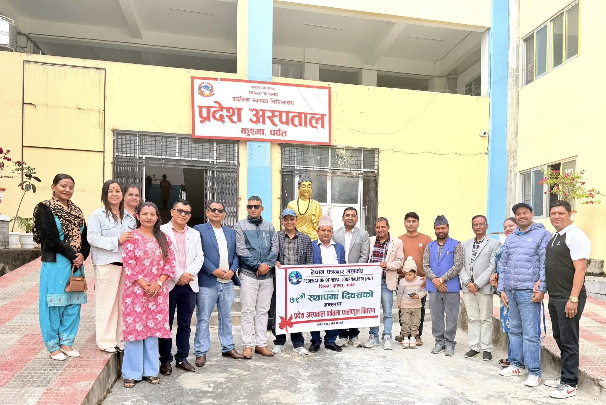 पर्वत।नेपाल पत्रकार महासंघको ७१ औँ स्थापना दिवस पर्वतमा पनि मनाईएको छ । दिवसको अवसरमा प्रदेश अस्पताल पर्वतमा उपचाररत बिरामीहरुलाई फलफुल वितरण गरिएको छ । अस्पतालमा उपचाररत १२ जना बिरामीहरुलाई फलफुल वितरण गरिएको छ ।स्थापना दिवसमा सामाजिक दायित्व पुरा गर्ने उद्धेश्यले बिरामीहरुको स्वास्थ्यलाभको कामना सहित फलफुल वितरण गर्नुका साथै शुभकामना आदानप्रदान समेत गरिएको थियो ।